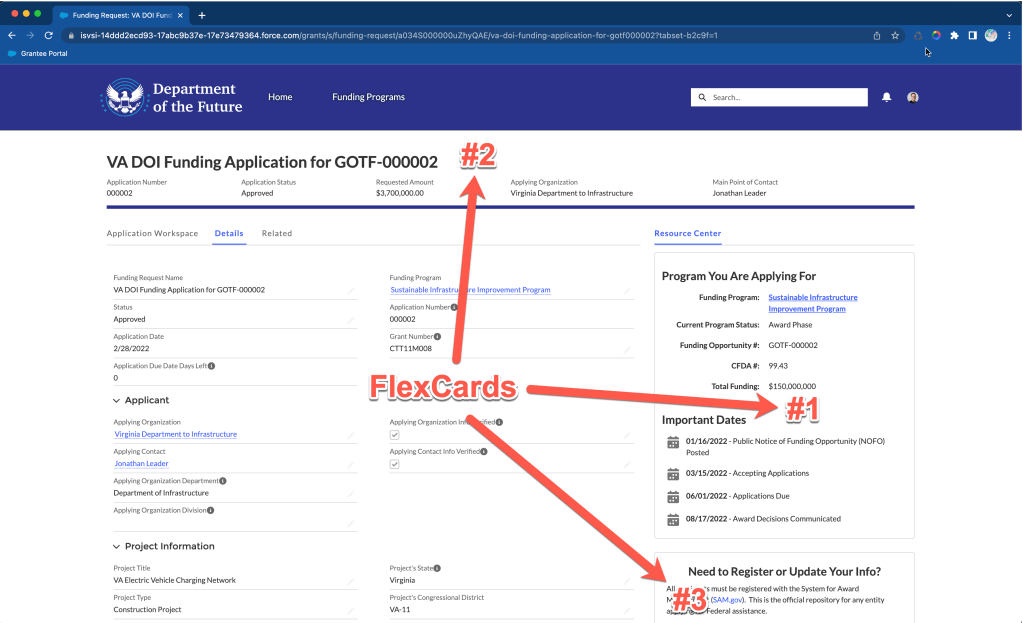 The FlexCard is looking at a relationship field on the application for the related grant program and then displaying program-related fields.
