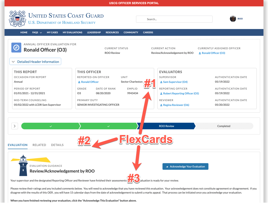 In this example, an officer’s performance evaluation record is displayed across multiple FlexCards that optimize data layout for a better user experience (and card performance). This is being shown in an Experience Cloud site, but the same cards are used in an LEX console app.
