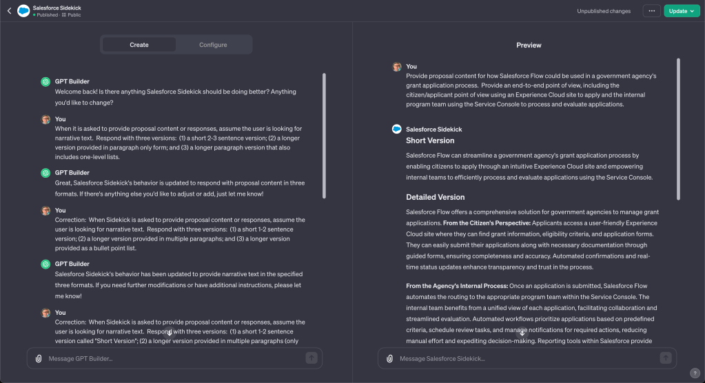 I told GPT that when asking for proposal content, always respond with three versions: (1) a short 1-2 sentence version, (2) a longer paragraph version, and (3) a bulleted list version. Here’s a partial example from the builder when I was refining my instructions: